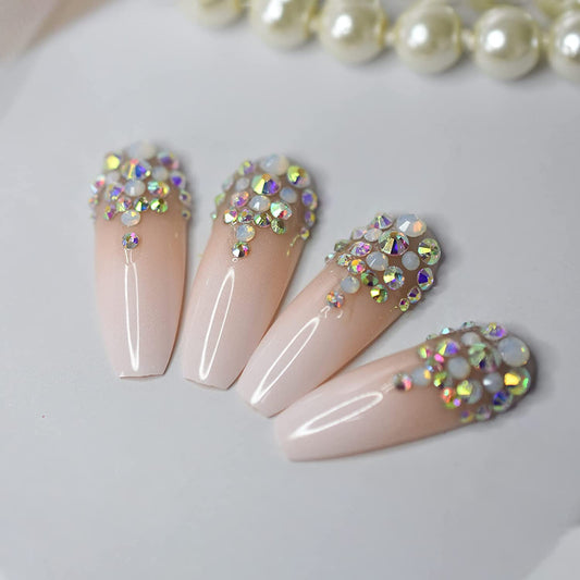 Sparkle Pop | Diamond Nude Pink, White Ombre French | 3D Crystal Design | Nail Art | Glossy | Ballerina | Extra Long | Reusable Press On Nails Set
