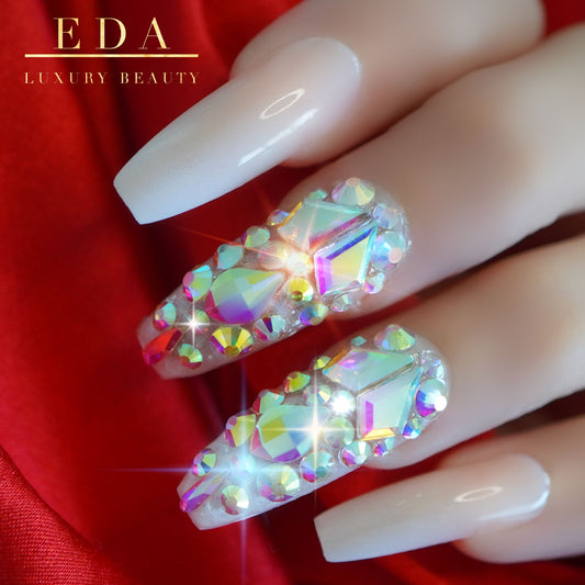 Sparkle Diva | Diamond Nude Pink, White Ombre French | 3D Crystal Design | Nail Art | Glossy | Ballerina | Extra Long | Reusable Press On Nails Set