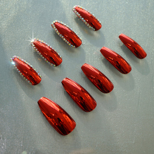Firelight Glow | Diamond Red | 3D Crystal Design | Nail Art | Glossy, Holographic | Ballerina | Extra Long | Reusable Press On Nails Set
