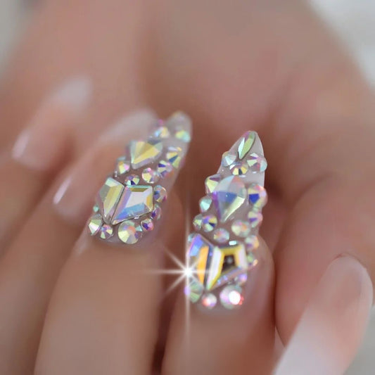 Ice Queen | Diamond Nude Pink, White Ombre French | 3D Crystal & Gemstone Design | Nail Art | Glossy | Sharp, Stiletto | Extra Long | Reusable Press On Nails Set