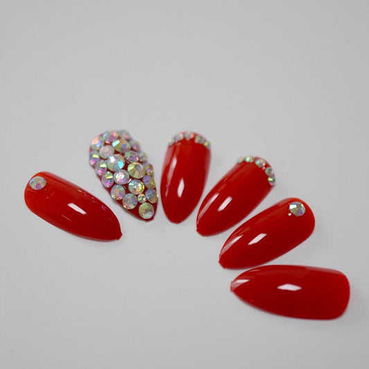Rouge Charm | Diamond Red | 3D Crystal Design | Nail Art | Glossy | Almond Stiletto | Long | Reusable Press On Nails Set