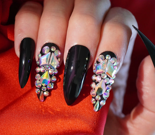 Noir Sparkle | Diamond Black | 3D Crystal Design | Nail Art | Glossy | Sharp, Stiletto | Extra Long | Reusable Press On Nails Set