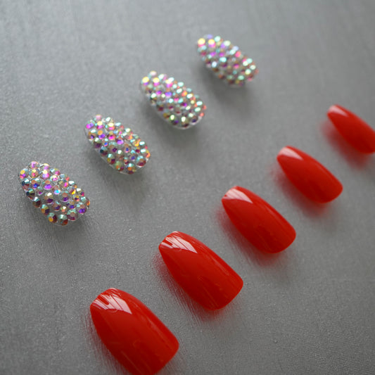 Daring Diva | Diamond Red | 3D Crystal Design | Nail Art | Glossy | Square, Coffin | Long | Reusable Press On Nails Set