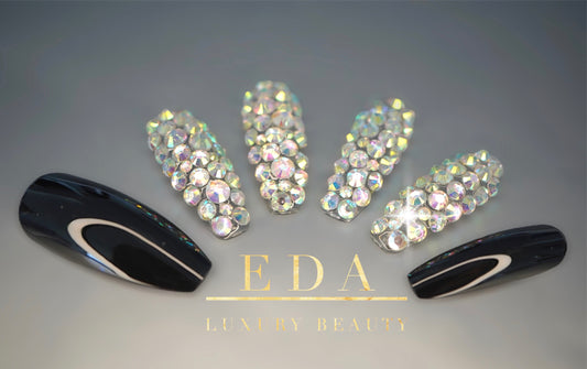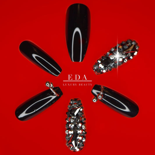 Sparkle Night | Diamond Black | 3D Crystal Design | Nail Art | Glossy | Ballerina | Extra Long | Reusable Press On Nails Set