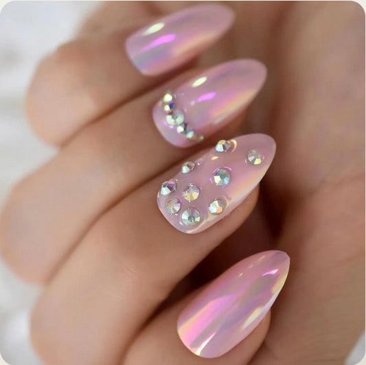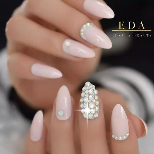 Prism Glow | Diamond Nude Pink | 3D Crystal Design | Nail Art | Glossy | Stiletto | Long | Reusable Press On Nails Set