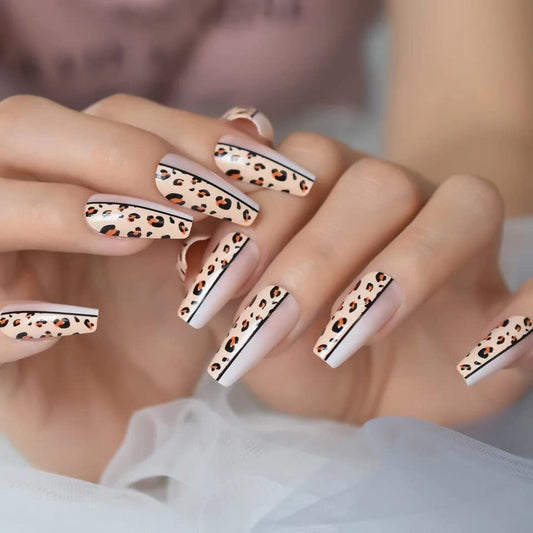Wild Side | Nude Pink White Ombre French | Animal Print | Glossy | Ballerina | Extra Long | Reusable Press On Nails Set
