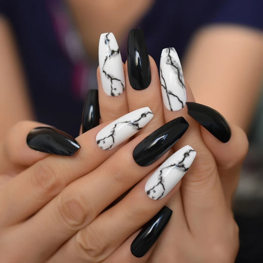 Gothic Touch | Black & White | Marble Design | Glossy | Ballerina | Extra Long | Reusable Press On Nails Set