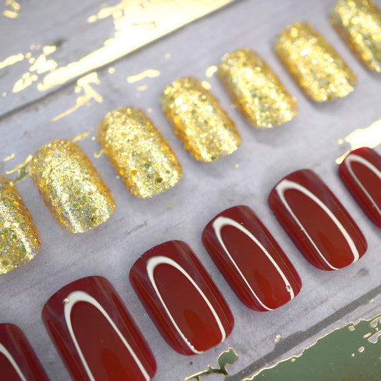 Shimmer Belle | Dark Red Burgundy Glitter Gold | Glossy Shimmer | Square | Medium Long | Reusable Press On Nails Set