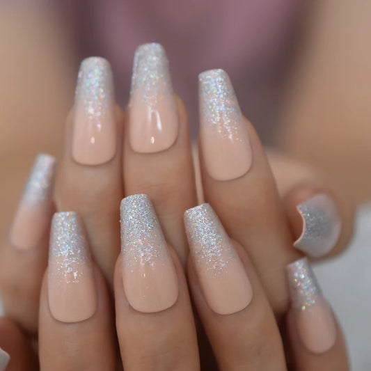 Shimmer Waves | Natural | Nude Pink, Silver Glitter Ombre French | Glossy | Ballerina | Extra Long | Reusable Press On Nails Set