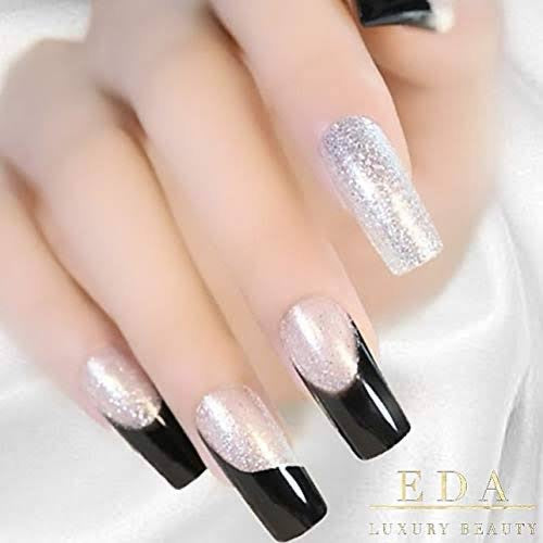 Gothic Glamour | Silver Glitter, Black French | Glossy | Square | Extra Long | Reusable Press On Nails Set