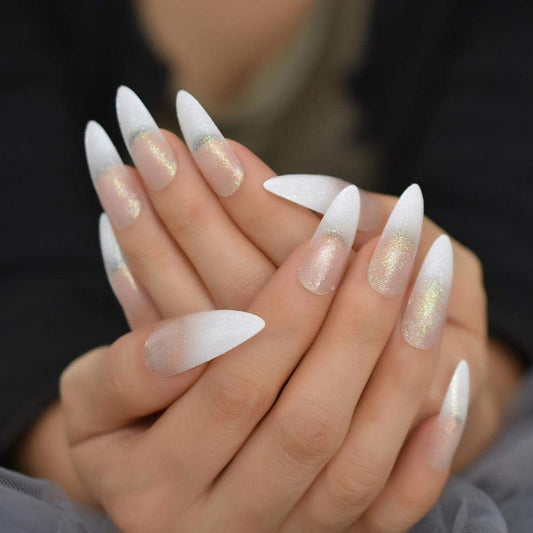 Twinkle Spark | Nude Pink, Glitter Ombre White French | Matte | Sharp, Stiletto | Extra Long | Reusable Press On Nails Set