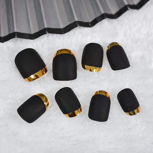 Velvet Magic | Black, Gold Chrome French | Matte | Square | Short | Reusable Press On Nails Set