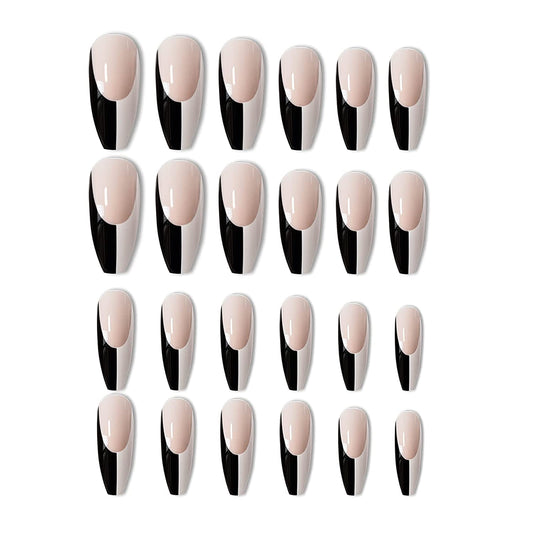 Rose Noir | Nude Pink, Black White French | Glossy | Ballerina | Extra Long | Reusable Press On Nails Set