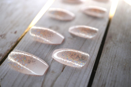 Shimmer Waves | Natural | Nude Pink, Silver Glitter Ombre French | Glossy | Ballerina | Extra Long | Reusable Press On Nails Set