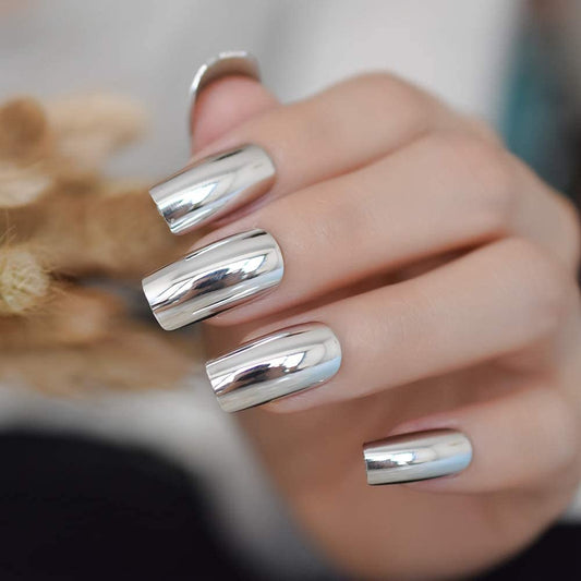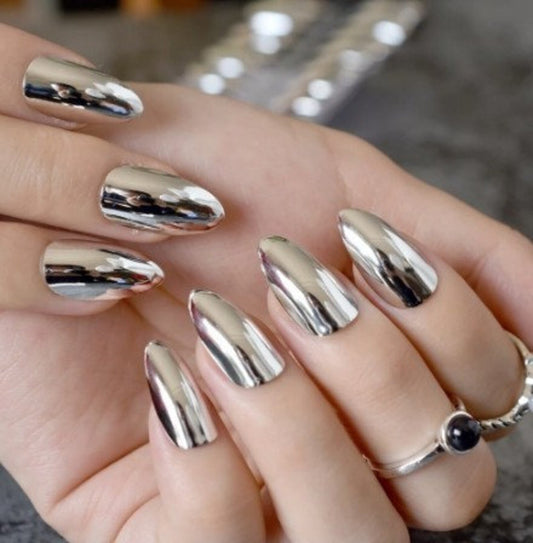 Space Shine | Silver | Mirror Design | Metallic, Glossy | Stiletto | Long | Reusable Press On Nails & Toe Nails Set