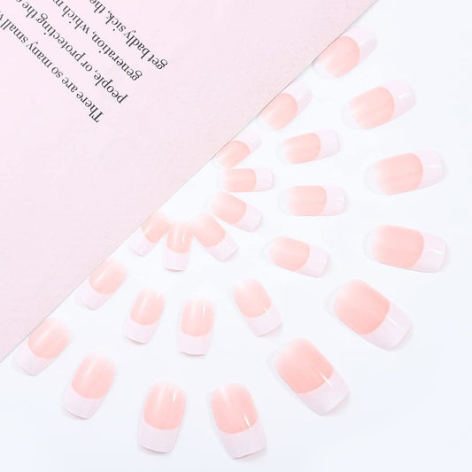 Classic French | Natural | Nude Pink, White French | Glossy | Square | Long | Reusable Press On Nails Set