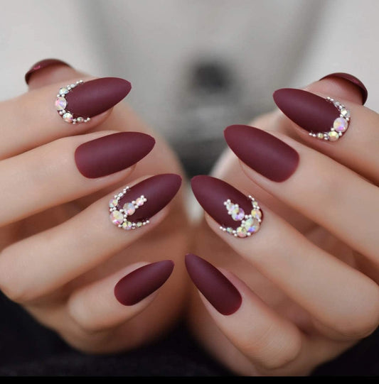 Prestige Passion | Diamond Red Burgundy | 3D Crystal Design | Nail Art | Matte | Stiletto | Long | Reusable Press On Nails Set