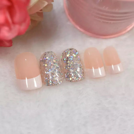 Cosmic Sparkle | Glitter, Nude Pink, White French | Glossy | Square | Long | Reusable Press On Nails Set