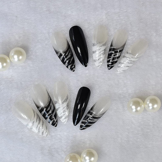 Shiny Zebra | Black, White Glitter French | Animal Print | Glossy | Sharp, Stiletto | Extra Long | Reusable Press On Nails Set