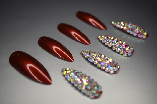 Merlot Kiss | Diamond Red Burgundy | 3D Crystal Design | Nail Art | Glossy | Sharp, Stiletto | Extra Long | Reusable Press On Nails Set