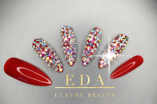 Rouge Glow | Diamond Red | 3D Crystal Design | Nail Art | Glossy | Sharp, Stiletto | Extra Long | Reusable Press On Nails Set