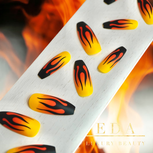 Dancing Heat | Yellow Red Ombre, Black Fire French | Matte | Ballerina | Extra Long | Reusable Press On Nails Set