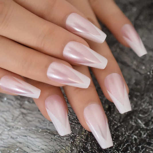 Majestic Chic | Natural | Pearl Satin Pink, White V French | Glossy | Ballerina | Extra Long | Reusable Press On Nails Set